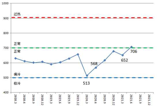 2021年二季度中国造船产能利用监测指数(CCI)为706点,比2020年二季度提高138点,同比增长24.3%;比2021年一季度增加54点,环比增长8.3%。