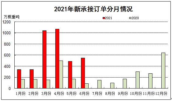 2021年上半年,全国造船完工量2092万载重吨,同比增长19.0%;承接新船订单量3824万载重吨,同比增长206.8%。截至6月底,手持船舶订单量8660万载重吨,同比增长13.1%,比2020年底手持订单增长21.8%。
