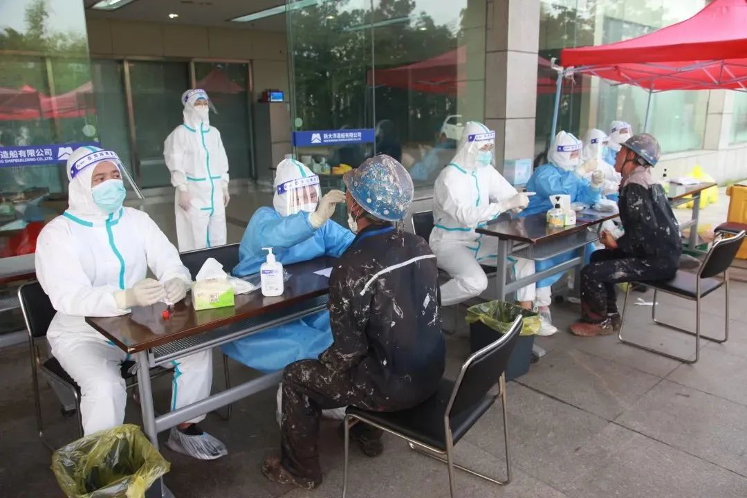 面对新冠疫情防控的严峻形势,8月1日下午,新大洋造船疫情防控指挥部接镇政府通知,按照“应检尽检”的原则,连夜开展全员核酸检测。