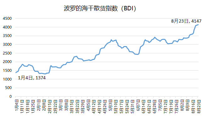 受益于干散货市场需求强劲,波罗的海干散货指数(BDI)连续九个交易日上涨,8月23日报4147点,较月初上涨26%,较年初上涨201%,比上年同期上涨178%。