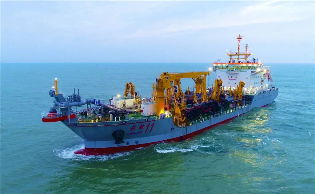 “长鲸11”轮是公司为长江航道局建造的长江下游12.5米深水航道维护疏浚6000立方自航耙吸挖泥船“长鲸7”的续建船。船长122米,型宽24.8米,型深9.6米,泥舱舱容6000m3,最大载泥量11600吨;配置三台4224KW主发和一台1500KW主发,通过全电力变频驱动2台推进器、2台舱内泵、两台水下泵、2台高压冲水泵以及2台艏侧推;自由航速14.8Kn,挖深28/38米,可挖淤泥、粘土、泥粉砂、中细沙、粗砂、碎石和卵石。