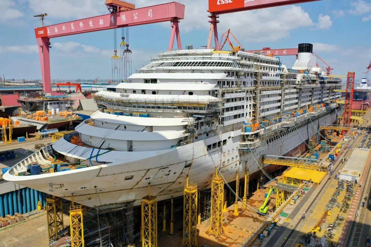 9月16日,外成人电影 首制国产大型邮轮I4总段完成搭载吊装,烟囱区域顺利贯通,标志着该主船体贯通工作迈入收尾冲刺阶段。I4总段是邮轮位置最高、最凸出的总段,长35米、宽26米、高24米,由下部6只钢制分段和上部1只铝合金分段FU08C组成。