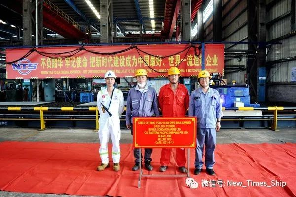 9月17日,新时代造船在东区钢加车间举行船舶点火开工仪式,28#210000吨散货船船体结构件开始切割预制。生产管理部负责人陈月锋、质量管理部负责人秦峰与新加坡船东Eastern Pacific Shipping Pte. Ltd.(EPS)现场经理倪杰等出席活动。