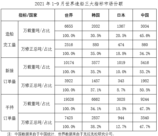 1~9月,我国造船完工量、新接订单量、手持订单量分别占世界市场份额的45.6%、53.2%和47.3%。