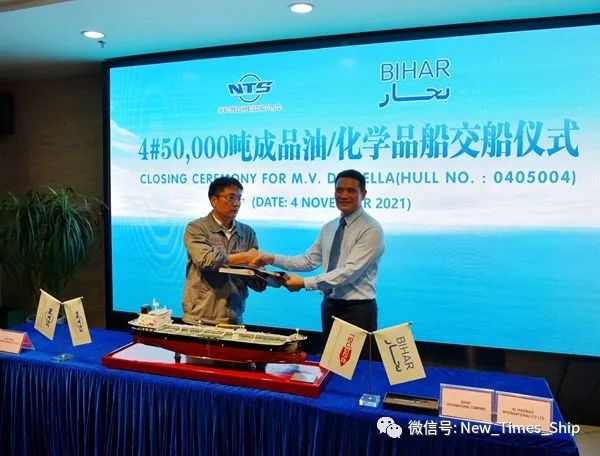 11月4日,新时代造船举行船舶签字交付仪式,4#50000吨化学品/油船顺利交付船东沙特BIHAR INTERNATIONAL COMPANY运营。公司总经理刘海金、常务副总经理张玉永、副总经理袁衡与船东沙特BIHAR INTERNATIONAL COMPANY的代表、ABS船级社代表等嘉宾共同出席活动,见证船舶交付。