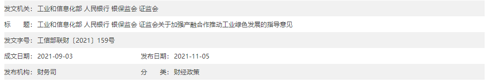 近期,我国发布了《关于完整准确全面贯彻新发展理念做好碳达峰碳中和工作的意见》和《2030年前碳达峰行动方案》。为贯彻落实习近平总书记关于金融服务实体经济系列重要指示精神和党中央、国务院关于碳达峰、碳中和重大决策部署,工业和信息化部、人民银行、银保监会、证监会联合发布《关于加强产融合作推动工业绿色发展的指导意见》(工信部联财〔2021〕159号),建立商业可持续的产融合作推动工业绿色发展路径,推动建设工业绿色低碳转型与工业赋能绿色发展相互促进、深度融合的产业体系,以工业绿色化引领高端化、智能化发展,促进工业稳增长和有效投资,助力制造强国和网络强国建设,推动经济社会绿色发展,为应对全球气候变化贡献力量。