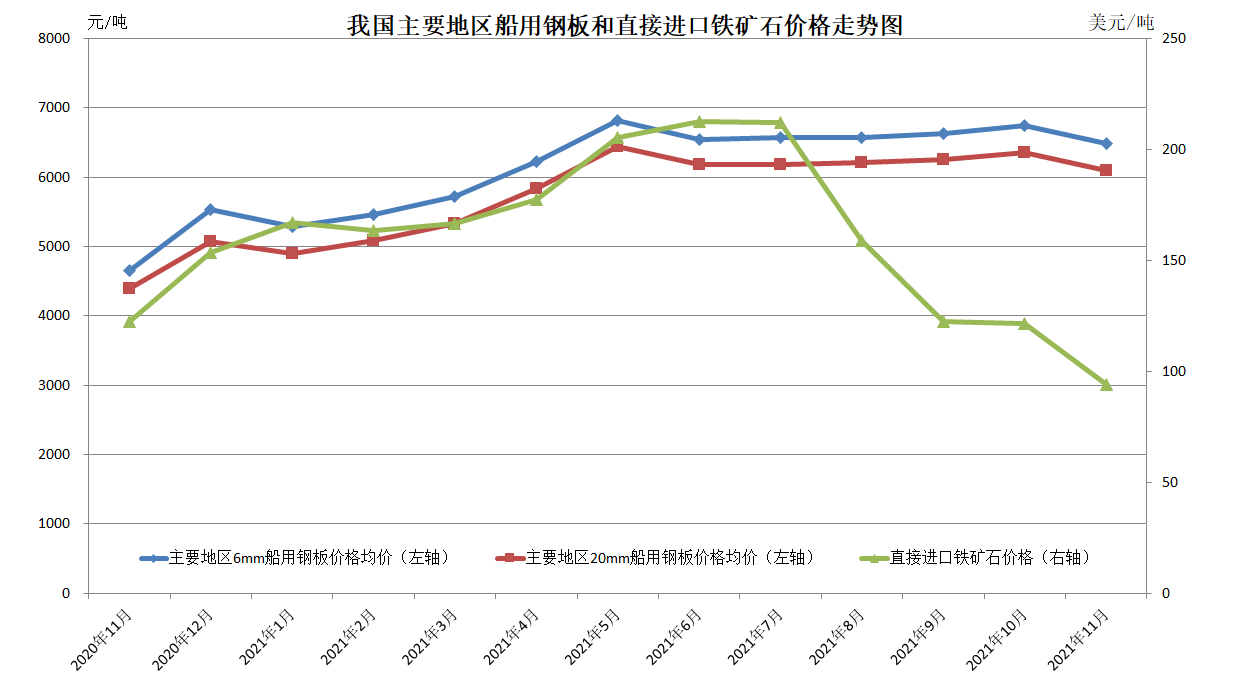 伴随着铁矿石价格连续下跌,钢材现货价格跟随下调,11月12日,主要地区20mm船用钢板价格均价(含税价)为6020元/吨,较年内高点下跌16%,主要地区6mm船用钢板价格均价(含税价)为6420元/吨,较年内高点下跌15%。
