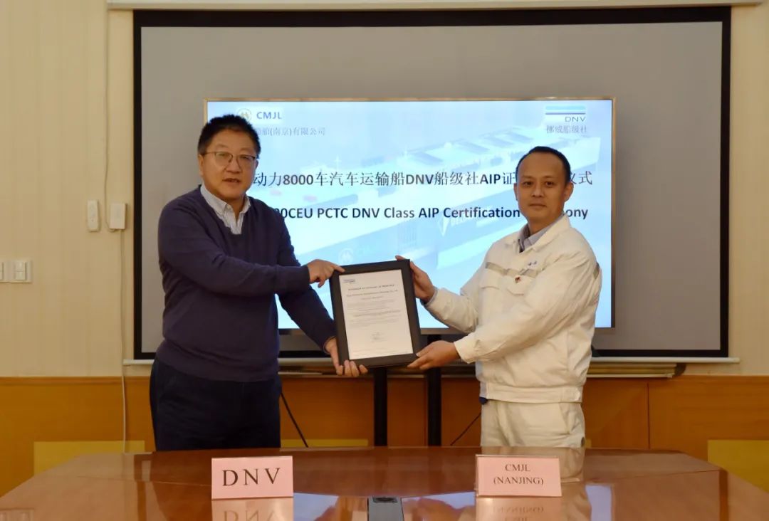 近日,由招商工业南京金陵船厂自主研发设计的新一代LNG动力8000车汽车运输船船型,获挪威船级社(DNV)原则性认可(AIP)证书,双方举行了AIP证书颁发仪式。DNV船级社南京站经理赵奎与南京金陵常务副总经理丁健亮参加证书颁发仪式,DNV船级社南京站总经理尹红波出席见证。