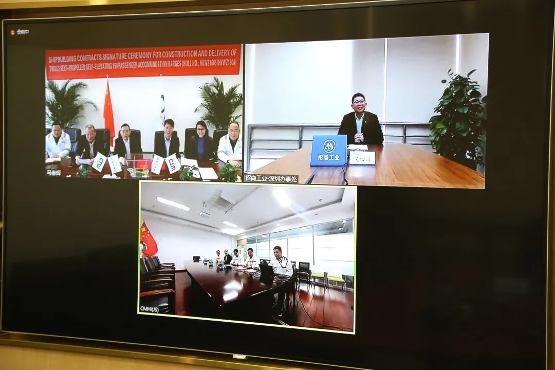 随着全球原油价格的回升,海工市场逐步回暖;招商局重工(江苏)有限公司与华科五洲(天津)海洋工程有限公司(简称“华科五洲”)于2022年1月14日上午通过线上“云签约”2座 350FT多功能油气服务平台买卖建造合同。华科五洲董事长黄雪飞,顾问王兆刚,船级社代表,招商工业副总经理吴四川,招商局重工(江苏)总经理梅中华在线出席签约仪式。