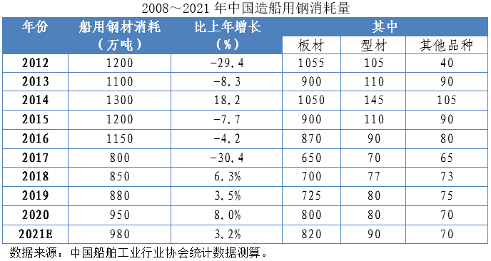 2021年我国造船用钢总量约980万吨,同比增长3.2%。