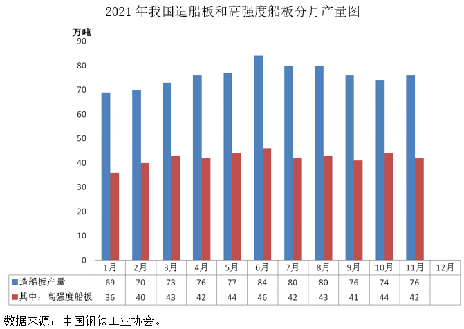 2021年,我国钢铁企业造船板产量呈现先抑后扬态势。1月份造船板生产量为69万吨,同比下降21.5%,自二季度开始快速企稳回升,11月产量达76万吨,同比增长7%。骨干钢铁企业持续加大生产力度,全力满足船厂需求。分季度看,一季度造船板月均产量71万吨,第二、三、四季度月均产量均保持在80万吨左右。