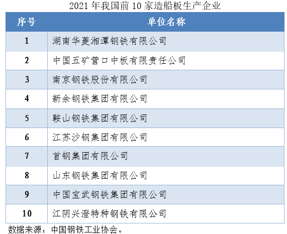 2021年,生产造船板的钢铁企业比上年增加5家,17家钢铁企业生产造船板759万吨,其中高强度板463万吨。湘钢、五矿营口中板、南钢处于领先地位,造船板产量均突破100万吨;山钢造船板产量连续两年同比增幅超过50%;柳钢、唐中板、鄂钢、邯钢、兴澄特钢等5家企业为了满足船舶企业的需求,重新启用造船板生产线。