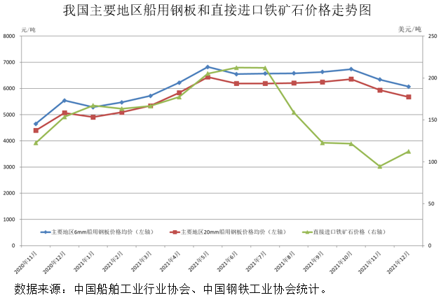 价格飙升成为2021年造船板市场的关键词。铁矿石价格大幅上涨推高了造船板价格,2021年5月,国内6毫米造船板和20毫米造船板均价分别达到7136元/吨和6636元/吨,创下近10年新高。虽然年末铁矿石价格震荡回落至118美元/吨,比年初下降27.2%,但受国内供求关系影响,造船板价格并未出现明显下降。12月底,国内6毫米造船板和20毫米造船板均价分别为6010元/吨和5610元/吨,比年初分别上涨13.7%和14.3%。