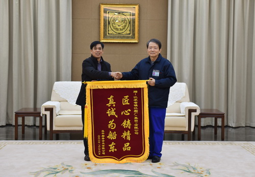 益丰船务企业有限公司副总经理李德亮向镇江船厂董事长郭琰赠送了锦旗。