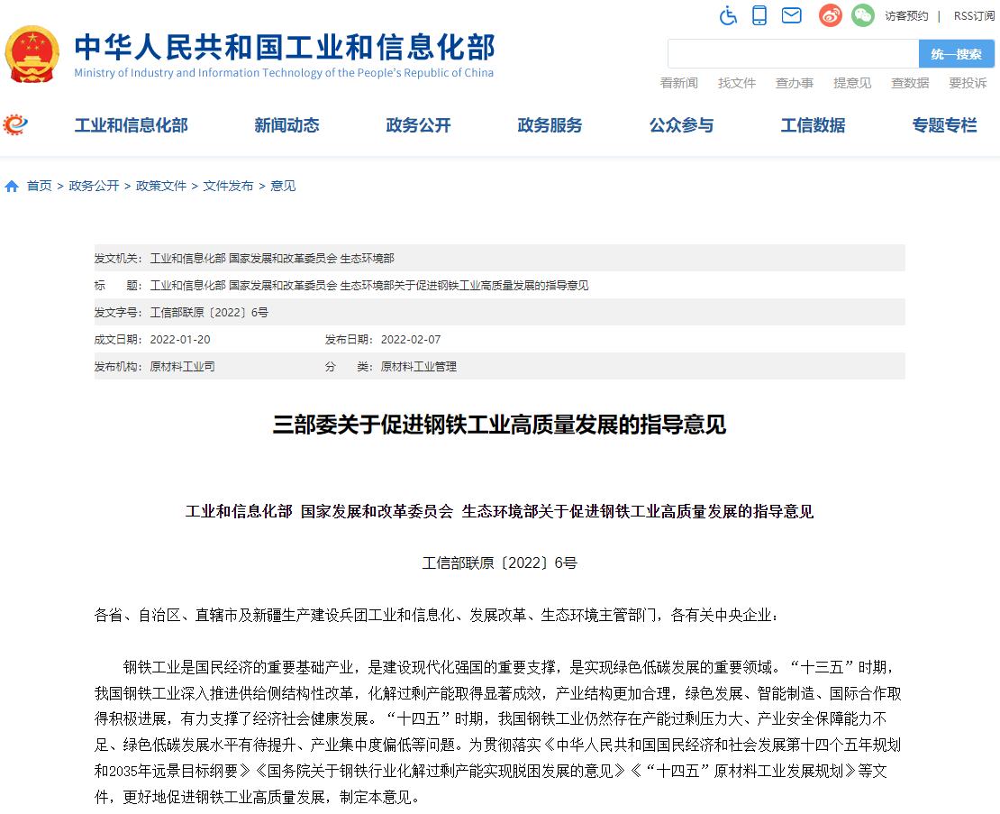 2月7日,工业和信息化部、国家发展和改革委员会、生态环境部联合发布《关于促进钢铁工业高质量发展的指导意见》(以下简称《意见》)。《意见》指出,力争到2025年,钢铁工业基本形成布局结构合理、资源供应稳定、技术装备先进、质量品牌突出、智能化水平高、全球竞争力强、绿色低碳可持续的高质量发展格局。