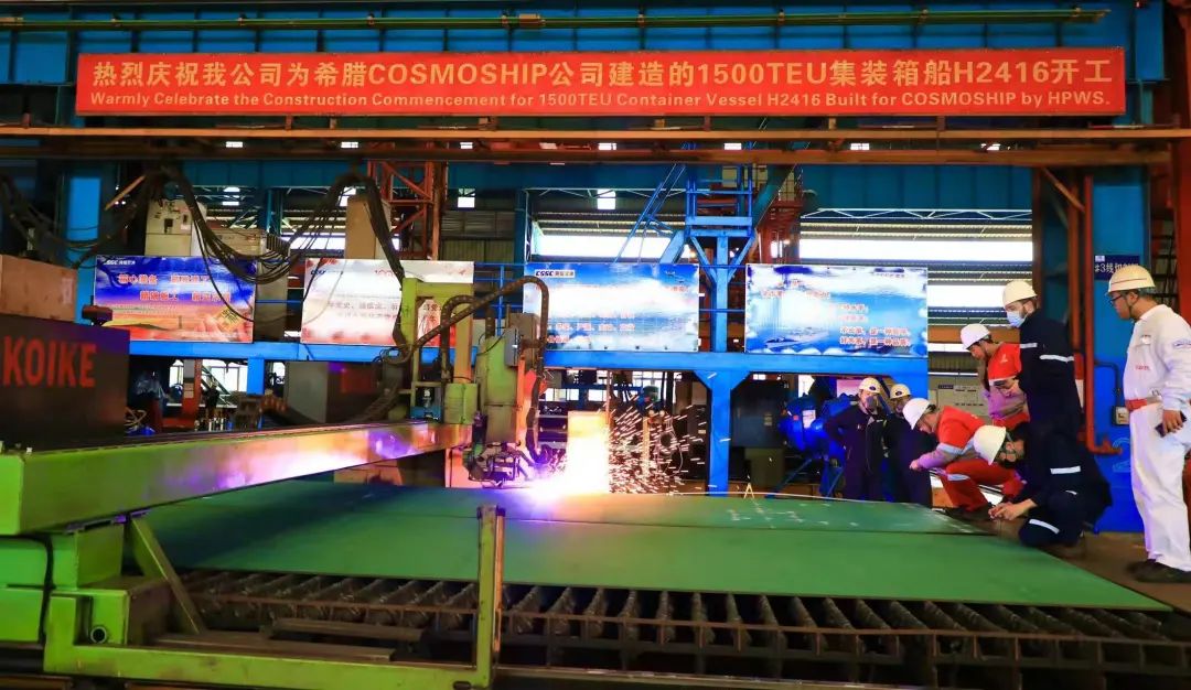 2月21日,中船黄埔文冲船舶有限公司承接的希腊COSMOSHIP公司的1500TEU集装箱船开工。船东代表、船级社代表和船厂代表出席了开工仪式。