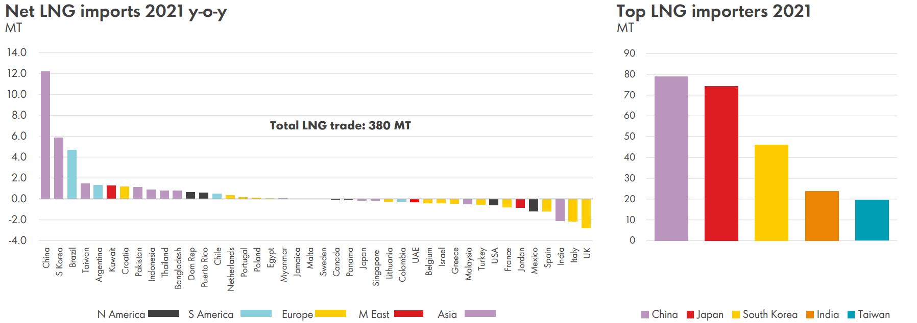 在需求方面,2021年,中国、韩国和日本继续引领LNG需求的增长。中国的LNG进口量增加了1200万吨,达到7900万吨,超过日本成为世界上最大的液化天然气进口国。