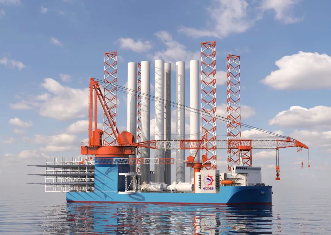 一是设计先进。平台总长约136米,型宽约50米,型深约10米,是一座桁架式四桩腿齿轮齿条式自升式风电安装平台,甲板作业面积约4500平方米,船艉设置一台1600吨绕桩式全回转起重机,船艏设置一台250吨全回转起重机。、