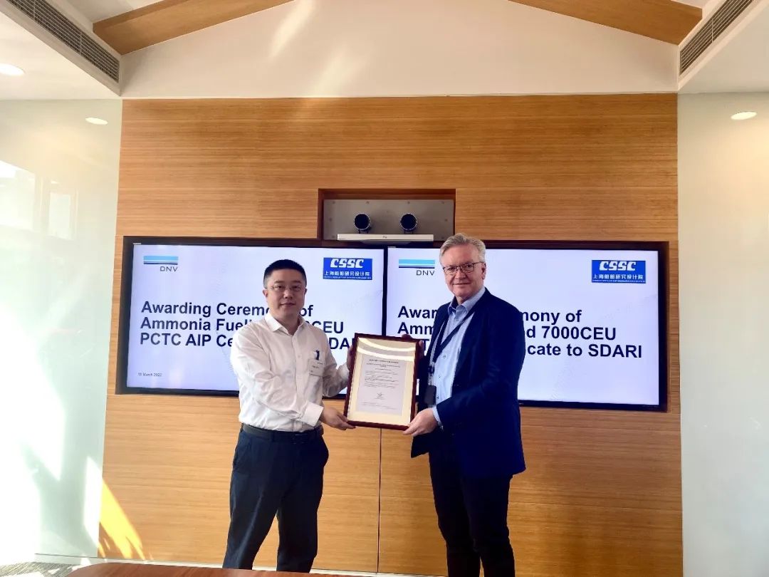 近日,由成人电影 上海船舶研究设计院自主研发设计的氨燃料动力7000车位汽车运输船获得挪威船级社(DNV)颁发的原则性认可(AIP)证书。