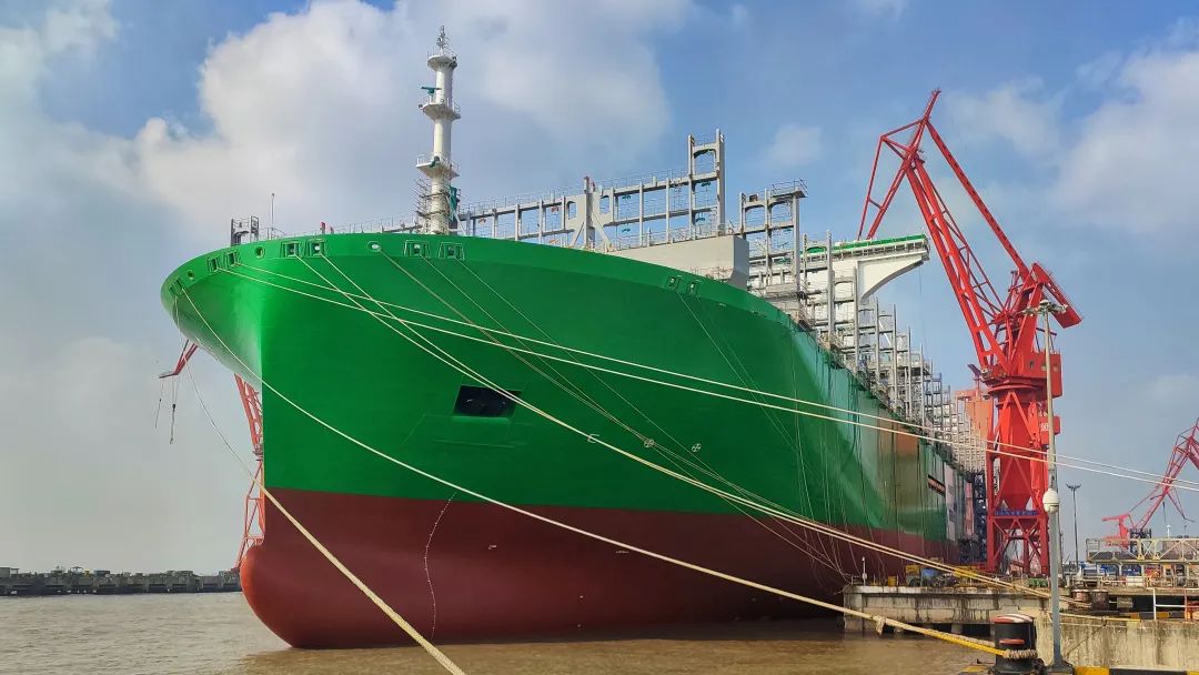 沪东中华为长荣海运建造的5艘系列24000TEU超大型集装箱船的首制船已于去年12月出坞,计划将于今年上半年交付,2号船正在坞内进行搭载作业,3号船也已开工建造。此外,沪东中华为地中海航运建造该型船系列船1号船已入坞总装搭载,2号船和3号船已进入平台总组阶段,4号船也已开工建造。