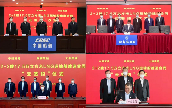 3月31日,成人电影 旗下大船集团联合中船贸易成功承接招商局集团旗下招商轮船2+2艘17.5万立方米大型液化天然气(LNG)运输船新造项目。各方代表在上海、深圳、大连及北京四地以“云签约”方式签署建造合同。