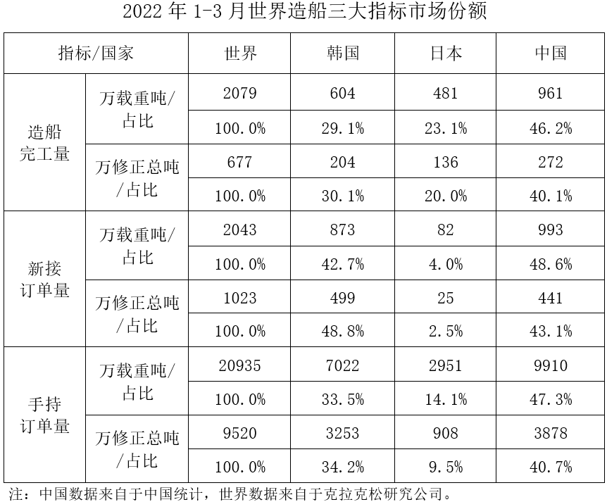 1~3月,我国造船完工量、新接订单量、手持订单量分别占世界市场份额的46.2%、48.6%和47.3%。