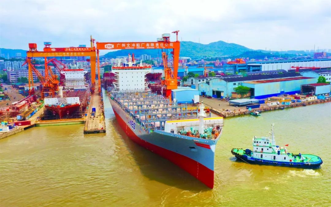 4月28日,,中船黄埔文冲建造的2038TEU集装箱船顺利出坞,创同系列船坞内建造周期最短、同等周期下状态最佳纪录,出坞完整性达89.2分。