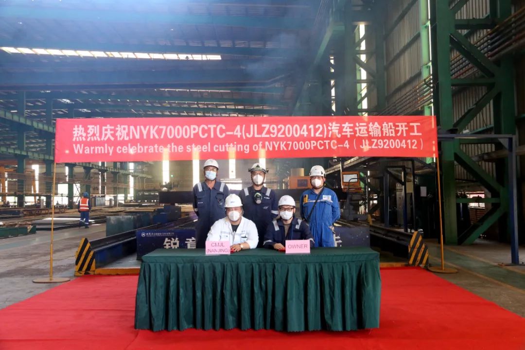 5月6日,招商工业南京金陵船厂为日本邮船(NYK)集团建造的第四艘7000车位液化天然气汽车运输船在仪征厂区顺利开工,船东驻厂代表、船级社驻厂代表及南京金陵项目组有关人员参加了开工仪式。随着驻厂船东代表Inoue先生按下数控切割点火按钮,等离子切割机下火花飞溅,第四艘7000车位汽车运输船正式开工。