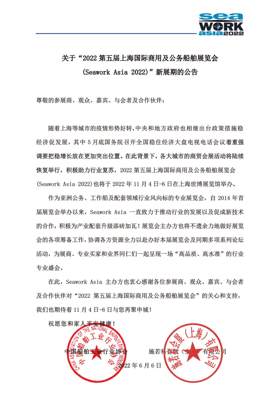 关于“2022第五届上海国际商用机公务船舶展览会”新展期的公告