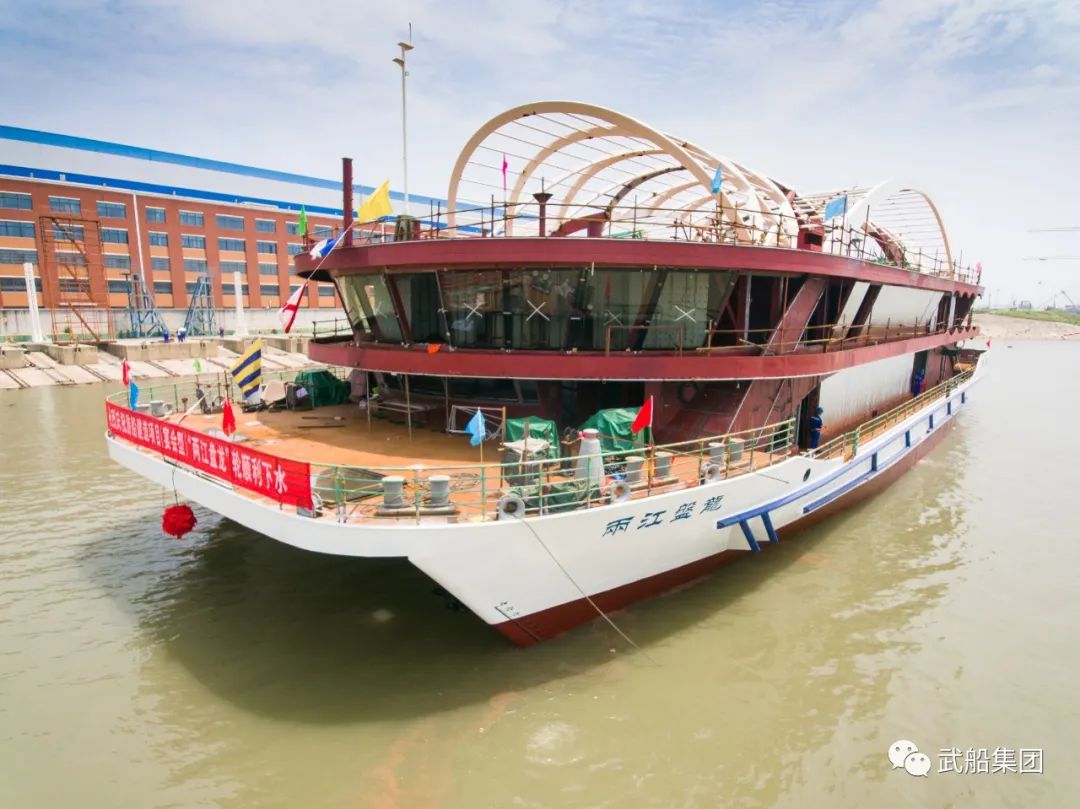 6月6日,由武船集团为武汉两江游览轮船旅游有限公司建造的宴会型“两江盘龙”轮顺利下水。该船姊妹船观光型“两江晴川”轮已于5月25日顺利下水。