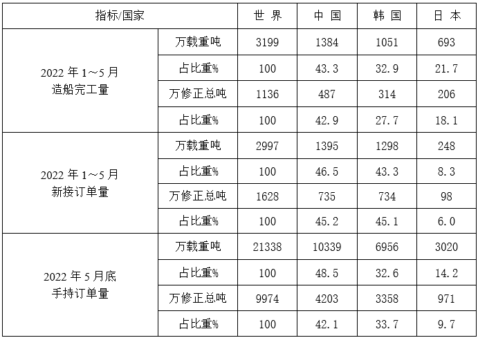2022年1~5月份世界造船三大指标