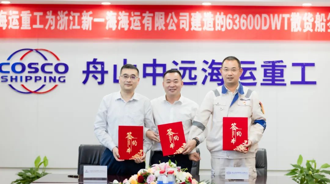 6月14日,舟山中远海运重工有限公司成功签署浙江新一海海运有限公司3艘63600载重吨散货船建造合同。此订单是舟山中远海运重工首次承接浙江省内新造船项目,也正式开启了“舟船舟造”的新篇章。