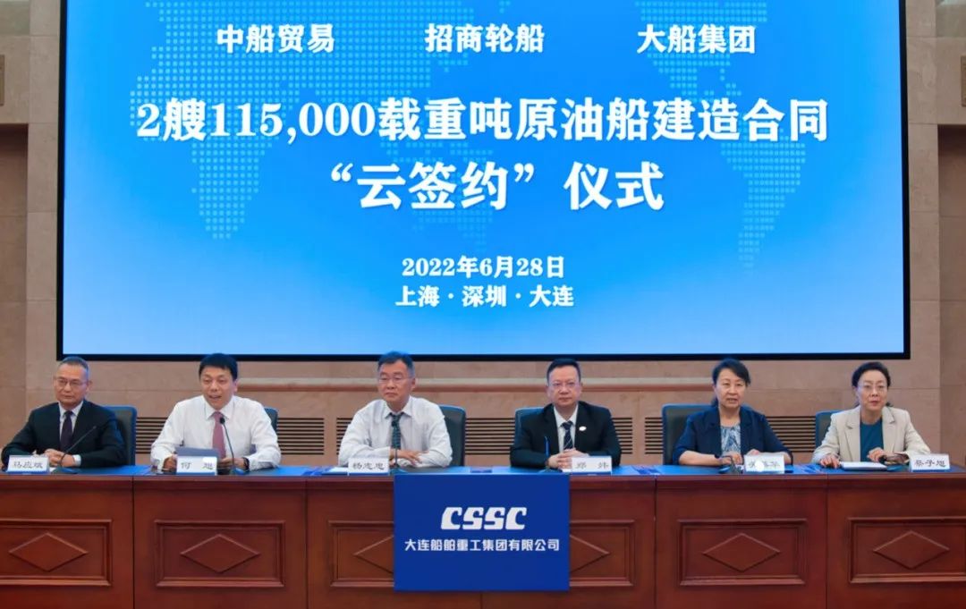 6月28日,成人电影 旗下大船集团联合中船贸易与招商轮船在大连、上海、深圳三地以视频形式“云”签署2艘11.5万吨原油船建造合同,三方代表在新船建造合同上签字。招商轮船党委书记、董事长谢春林,中船贸易党委副书记、总经理胡凯,大船集团领导杨志忠、郑炜等出席仪式。