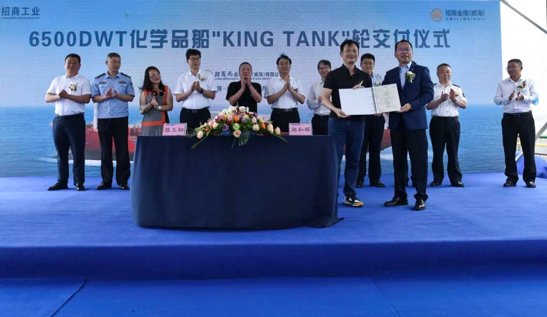 7月1日,威海金陵举行6500吨化学品船“KING TANK”轮交付仪式。香港金海海运有限公司董事长陈玉钿、执行董事王华国、董事邹蓬磊,招商工业党委书记、总经理胡贤甫,威海经开区党工委副书记、管委副主任王清,威海海关关长张东方,威海海事局局长张向上,威海出入境边防检查站站长钱亮,威海港引航站站长安建军,崮山镇党委书记张东明,意大利船级社中国区海事总经理范德洪,威海金陵党委书记、总经理郑和辉等领导和嘉宾出席仪式。