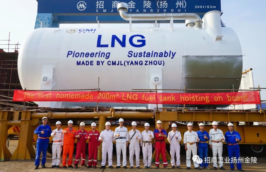 7月19日,扬州金陵首台自主设计、建造的200m³ LNG 燃料真空罐正式交付,吊装至6000吨双燃料化学品船上。