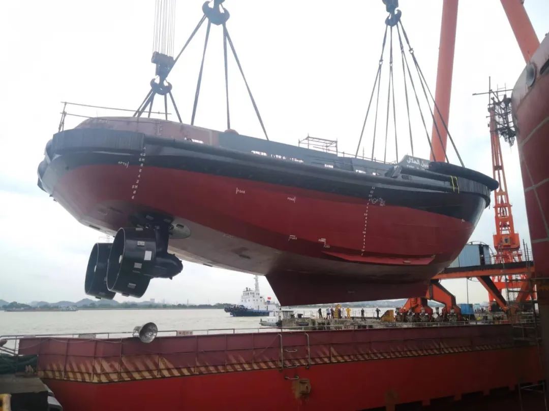该船是公司为苏伊士运河管理局建造的埃及75T TUG拖轮首制船。于7月18日在400T龙门吊底顺利吊装下水。该船于今年3月开工建造,计划9月交付。