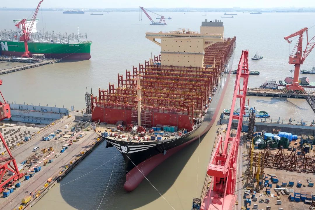 8月1日,沪东中华造船为地中海航运公司(MSC)建造的24116TEU超大型集装箱船在长兴造船基地顺利出坞。这是迄今为止全球建造的最大装箱量集装箱船,也是继今年6月22日完工交付24000TEU超大型集装箱船之后,沪东中华在全球顶级超大型集装箱船建造领域创下的又一项新纪录,标志着世界超大型集装箱船建造进入中国船舶引领的新纪元。