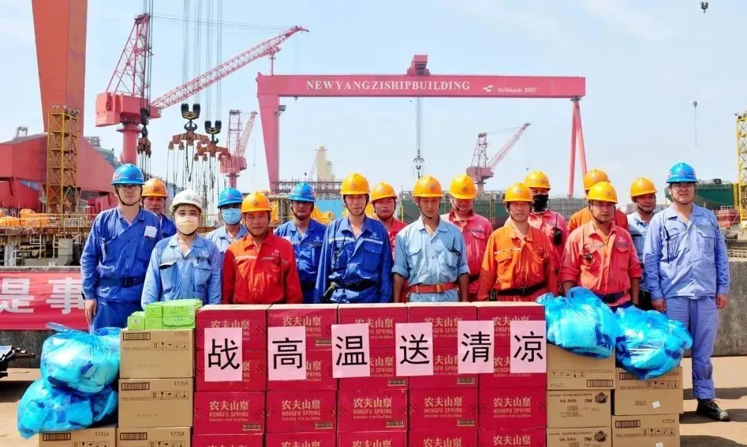 招商工业南京金陵工会组织人员在码头、坞台等施工人员临时休息区域设立冰镇饮料供应点,为夏日中的一线车间人员送去清凉,并错开高温上班,为员工提供有空调的休息室。