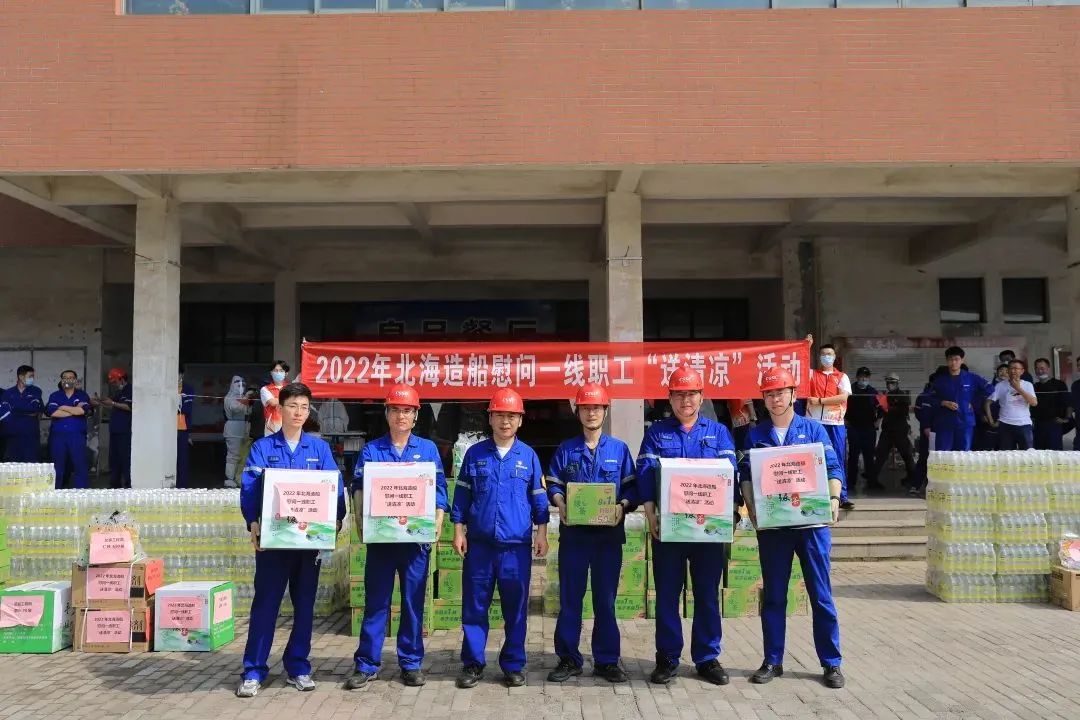 北海造船组织开展慰问生产一线职工“送清凉”活动。公司工会将盐汽水、绿茶饮料、茶叶、藿香正气合剂、仁丹等防暑降温物品一一送到相关一线单位的职工手中,把公司对一线职工的关心和慰问送到职工身边。