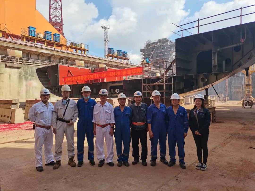 目前,该船分段及地面总组已进入尾声,除首部及部分横舱壁分段外已全部交出,为后续连续吊装创造了极为有利条件。搭载阶段,项目团队亦不辜负先行的努力,秉承一贯的快稳狠作风,战高温、斗酷暑,按照大环形总段的策划推进落实,让连续顺利搭载具备条件。