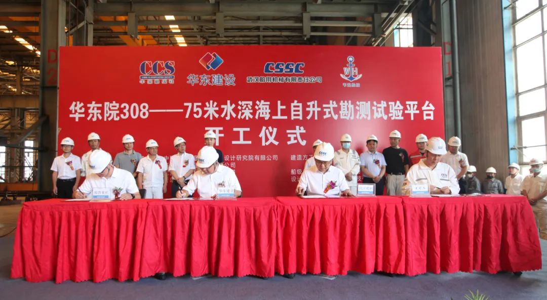 2022年8月26日,中国船舶武汉船机公司承建的华东院 308 -75米水深海上自升式勘测试验平台在青岛海西重机公司顺利开工。