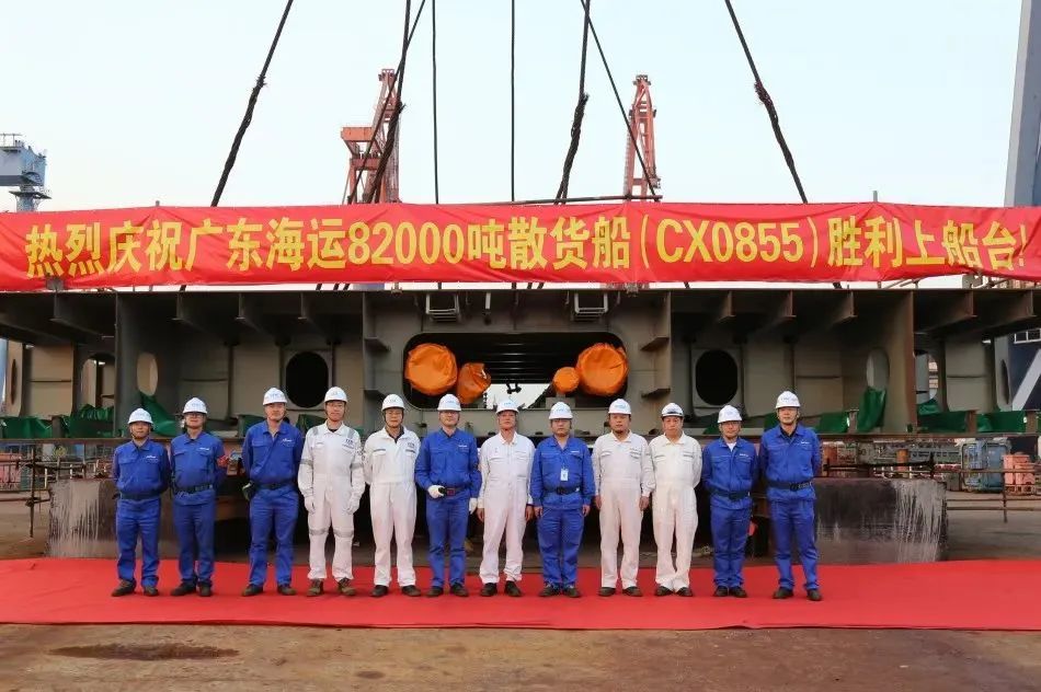 下午,由中船澄西为广东海运公司建造的50号82000吨散货船首个分段上船台,开始连续搭载。