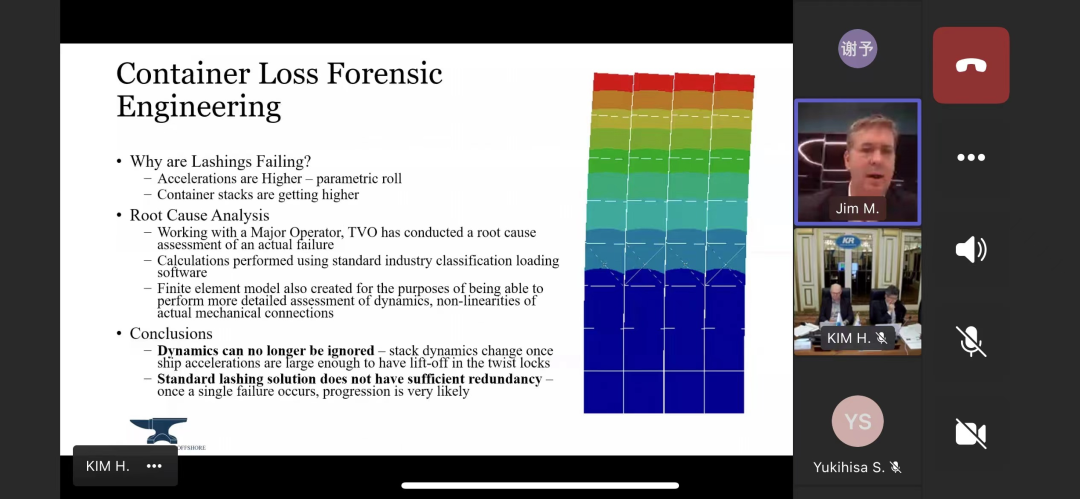 海洋安全议题,此次会议重点讨论了船舶低压燃料管系安全性、船舶系泊系统(集装箱缆绳)安全性等方面。IACS机械工作组主席Yukihisa Shibata发言表示,工作组计划对SOLAS公约中有关低压燃油管安全性的表述提出修订意见,包括防泄漏、防爆、防火、有效电子监控等方面内容,目前正在广泛搜集行业技术观点,计划在2023年开始,向IMO安全委员会及相关分工作组会议提供提案或评论。IACS船体工作组秘书长Jörg Peschmann发言指出,结合船东、货主以及保险公司的数据来看,集装箱船运输过程中出现的集装箱海损(遗失),主要原因中系泊缆绳质量低、系泊装置老旧化和系泊方式不合规占比明显,工作组将在该领域提出更多技术和标准建议。