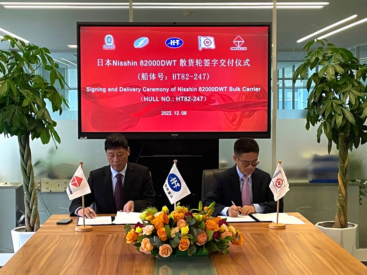 12月8日,韩通集团为日本Nisshin船东建造的第三艘82000吨散货轮 “BRILLIANT TRADER”成功签字交船。