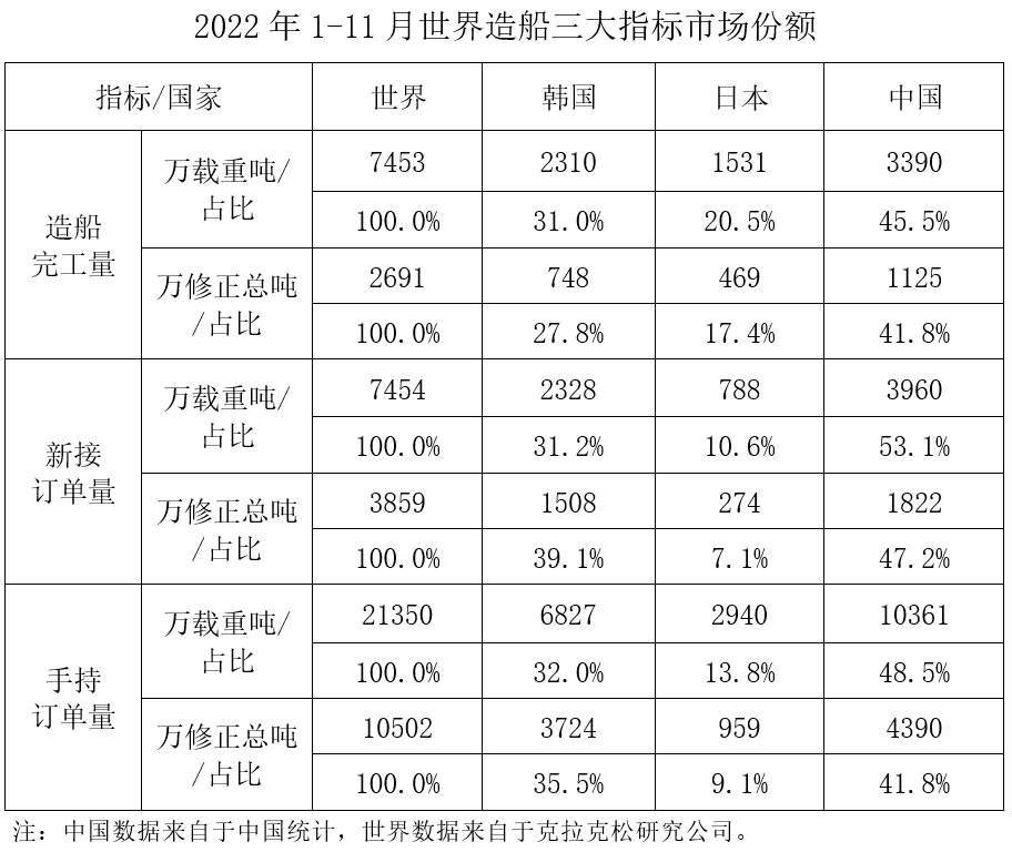 1~11月,我国造船完工量、新接订单量、手持订单量分别占世界市场份额的45.5%、53.1%和48.5%。