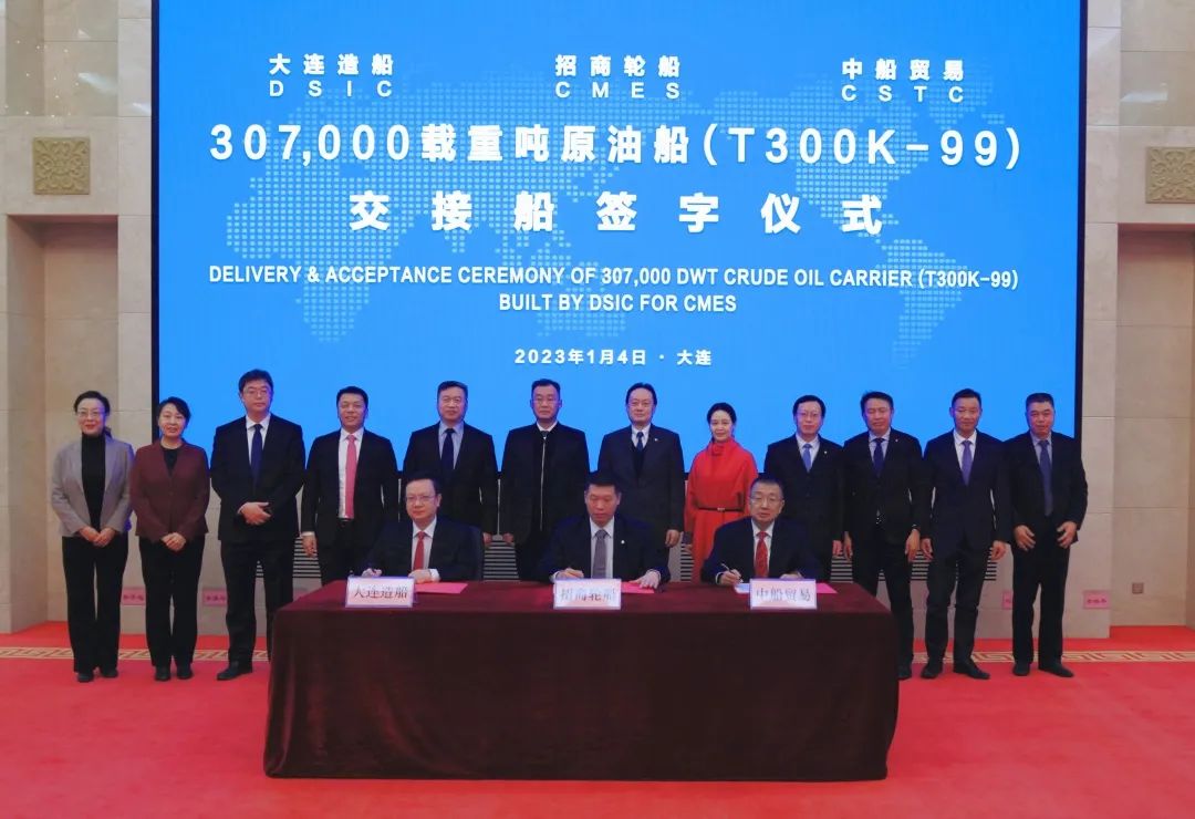 1月4日,中国船舶大连造船为招商轮船建造的30万吨VLCC99号船命名交工,双方代表在交接船证书上签字。