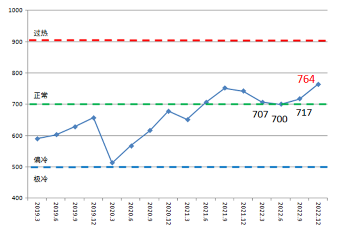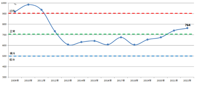 2022年中国造船产能利用监测指数(CCI)764点,达到近10年以来的最高点,与2021年相比提高22点,同比增长3.0%。