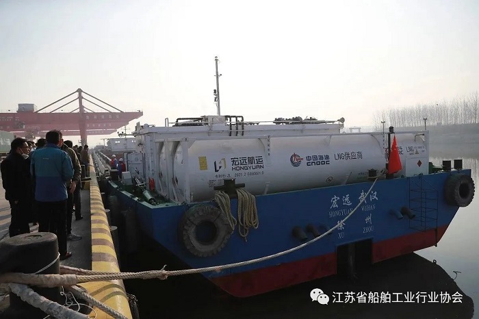 1月31日,由江苏科技大学和江苏现代造船技术有限公司管义锋教授团队设计研发的两艘移动换装补给200箱纯液化天然气(LNG)动力内河集装箱船在徐州正式鸣笛启航。此次首航的“宏远· 徐州”与“宏远·武汉”200箱LNG动力内河集装箱船,与传统船用LNG加注方式不同,采用换罐和加注的双重补给模式,是全国范围内的首次创新尝试,这标志着“LNG换罐补给模式”正式进入船舶燃料补给市场。