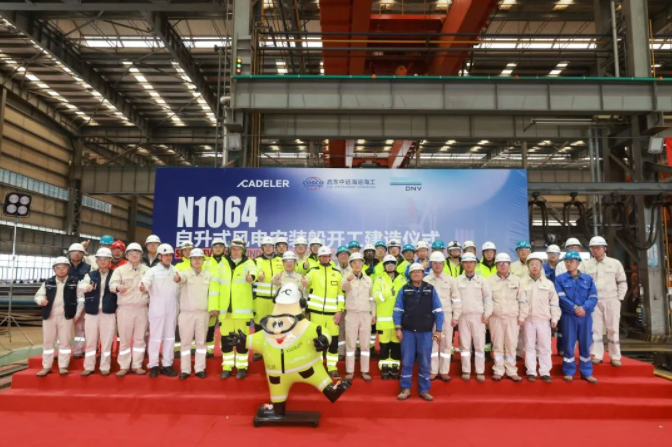 近日,启东中远海运海工举行N1064自升式风电安装船开工仪式。Cadeler公司,DNV船级社、中远海运重工经营中心领导、启东中远海运海工领导和项目组成员共40余人出席了开工仪式。
