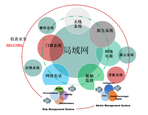 这艘船的IT系统由网络系统、IP电话系统、IP电视系统、IP CCTV系统、门禁系统组成,网络系统包含云平台网络设备、防火墙、交换机、WIFI6无线AP等;IP电视系统包含IPTV音视频系统、卫星接收机、APP、本地点播系统、网络点播系统、娱乐电视墙、音视频报警;IP CCTV系统包含CCTV管理平台、热成像摄像头、高清高速球机、智能识别半球和枪机、动态存储、联动报警;门禁系统包含门禁管理主机、发卡器、读卡器、实时在线系统。IT系统还满足双链路冗余要求,即当一个核心交换机失效后,另一个核心交换机能无缝切换。值得一提的是,该船IT系统由广船国际属下广州红帆科技有限公司研制提供,首次实现了相关系统的自主研发。